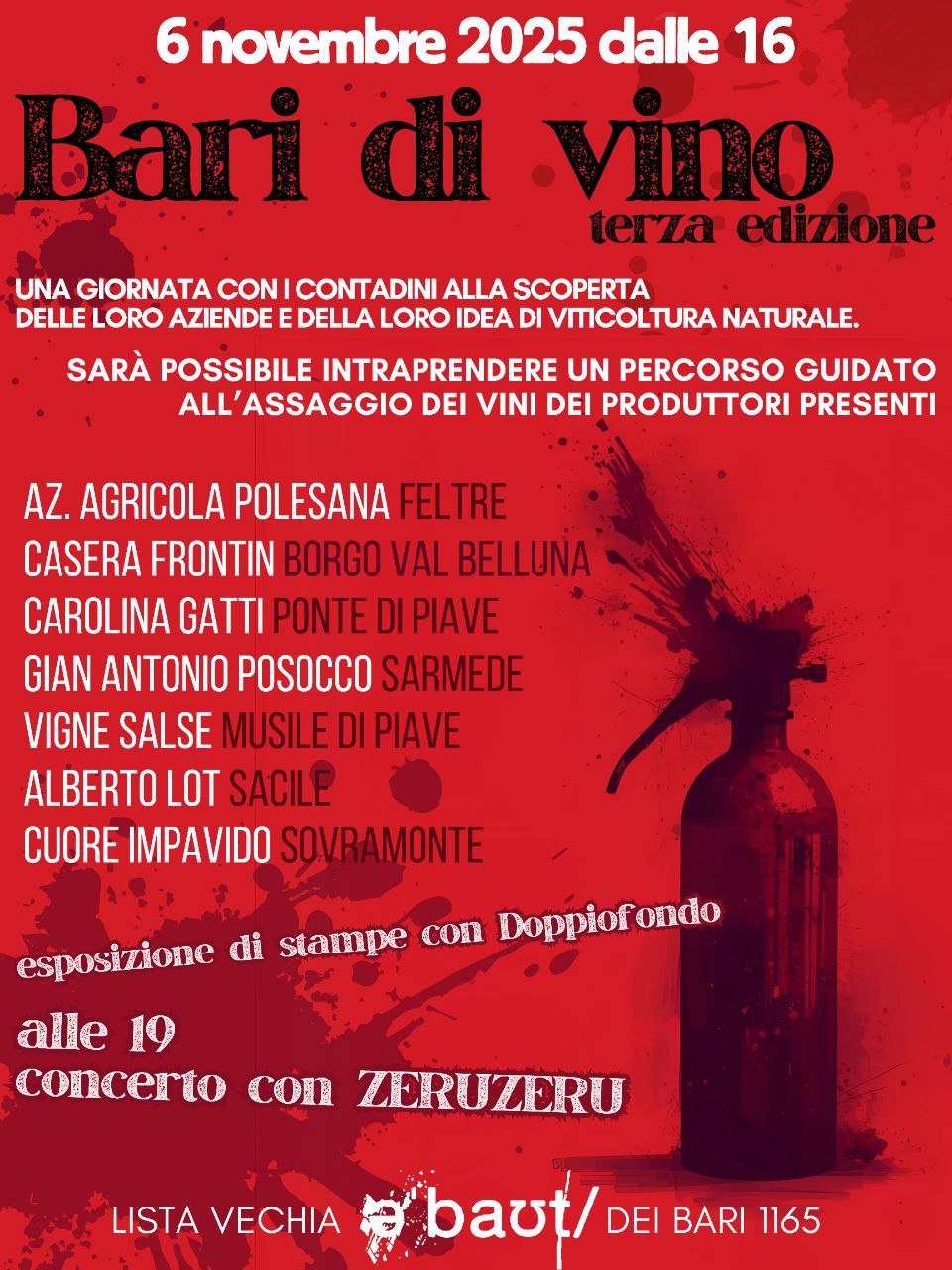 Ritorna, per la terza volta, "Bari di Vino": la giornata dedicata alla degustazione e alla scoperta dei vini naturali. Si inizia alle 16, orario da cui sarà possibile farsi accompagnare dai nostri amici contadini-viticoltori in un viaggio attraverso le loro tecniche di coltivazione, le loro passioni e le loro storie.